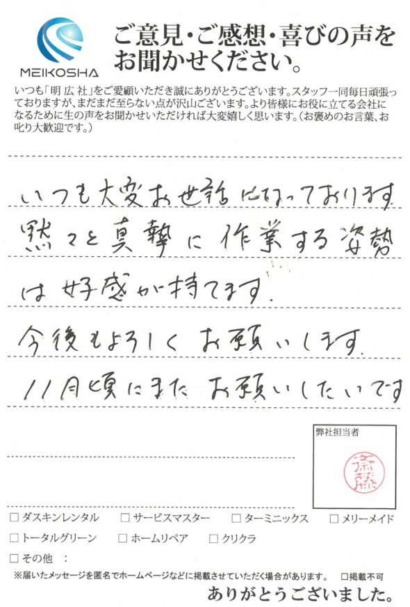 「いつも大変お世話になっております。黙々と真摯に作業する姿勢は好感が持てます。今後もよろしくお願いします。11月頃にまたお願いしたいです。」