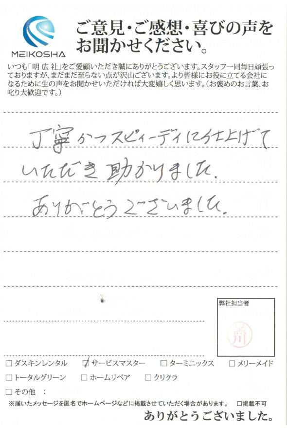 「丁寧かつスピーディーに仕上げていただき助かりました。ありがとうございました。」
