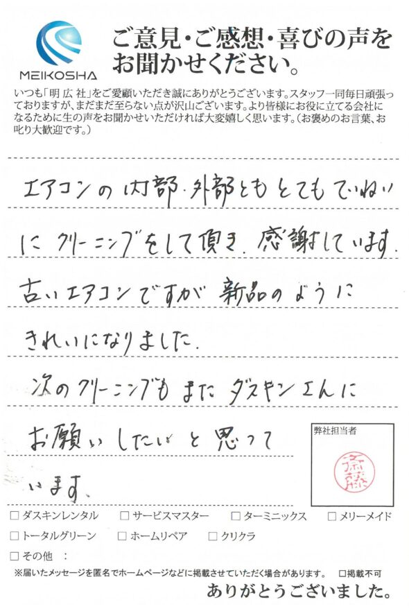 「エアコンの内部・外部ともとてもていねいにクリーニングをして頂き、感謝しています。古いエアコンですが新品のようにきれいになりました。次のクリーニングもダスキンさんにお願いしたいと思っています。」
