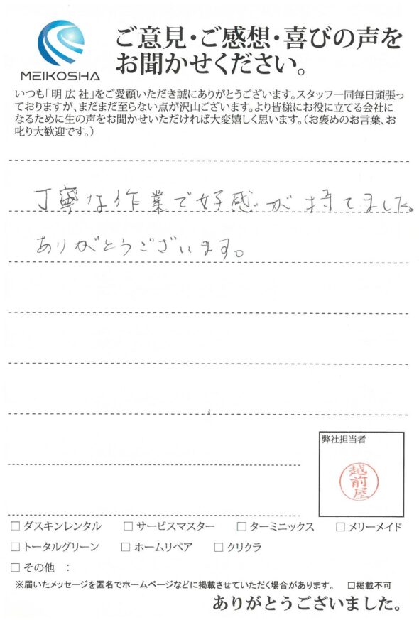 「丁寧な作業で好感が持てましたありがとうございます。」