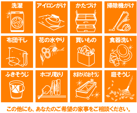 重量物の運搬・高所での作業・介護、介助・住居の修理、修繕・庭木の剪定・ベビーシッター・運転の代行・高級衣料の洗濯・貴金属のお手入れ・レンジフードやエアコンクリーニングなどの専門おそうじ など