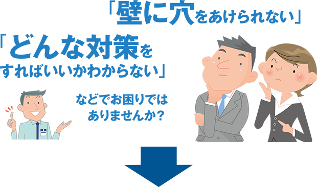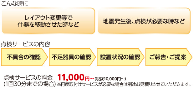 • ※什器ホルダーの設置後、震度6以下であっても、什器が転倒・落下・移動する場合があります。お客様は、予防には限界があることをご了承の上、本サービスをお申し込みいただいたものとみなします。