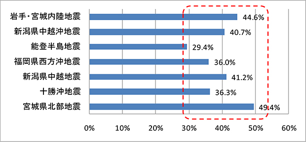 近年発生した地震でけがをした原因を調べると、約30%~50%の人が、家具の転倒・落下・移動によるものでした。