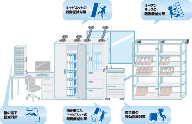もし、オフィスで地震がおこったら…什器の転倒・落下・移動が人命に関わることもあります。