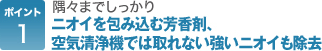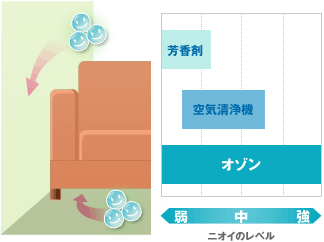 - ※臭気拡散エリア、素材への臭気吸収度、室内環境状態により、完全にニオイを取り除くことができない場合があります。
