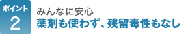 気体であるオゾンの特性を使うので、特別な薬剤は使用しません。また、悪臭を分解した後は酸素に戻るため、残留毒性もありません。