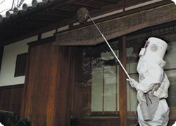 ハチ駆除システムの社内ライセンス資格を取得したプロのサービススタッフが防護服、専用資器材などを使用してハチ駆除、巣の除去を行います。