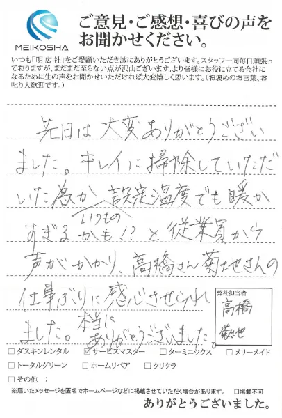 「先日は大変ありがとうございました。キレイに掃除してただいた為かいつもの設定温度でも暖かすぎるかも!?と従業員から声がかかり、高橋さん菊地さんの仕事ぶりに感心させたれました。本当にありがとうございました。」