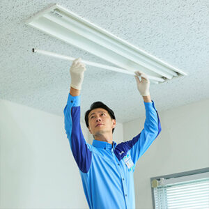 照明器具は手の届きにくい高所にあるので掃除がしにくく、ホコリやタバコのヤニなどで汚れています。それらの影響で明るさが損なわれると雰囲気まで暗くなり、経営や作業に影響を及ぼすことも考えられます。照明器具クリーニングは、専用の資器材を使って足場を組み、目には見えない部分についた汚れ、ヤニを落とします。